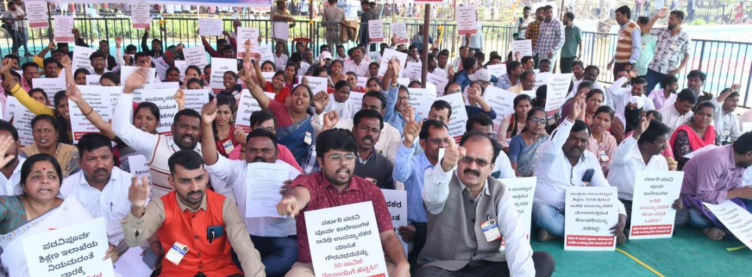 Guest lecturers from Government Pre-University Colleges gathered near the Suvarna Soudha in Belagavi on Tuesday to protest against the State government. The demonstrators, under the banner of the Government Pre-University Colleges Guest Lecturers Organization, voiced demands for regularisation, better wages, and improved working conditions.